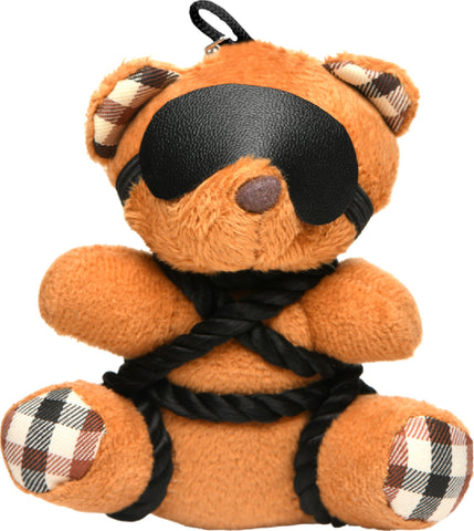 This little bondage bear just loves shi-bear-i! All tied up with silky rope and blindfolded, it's the perfect companion for your office desk, backpack, bag, purse or keychain! Give it as a gift to your friends or keep it for yourself. It's the cutest way to flag your kinky side! Fits in the palm of your hand. This kinky bondage bear is sure to put a smile on your face! Made out of polyester, PU faux leather, plastic and nickel-free metal.
